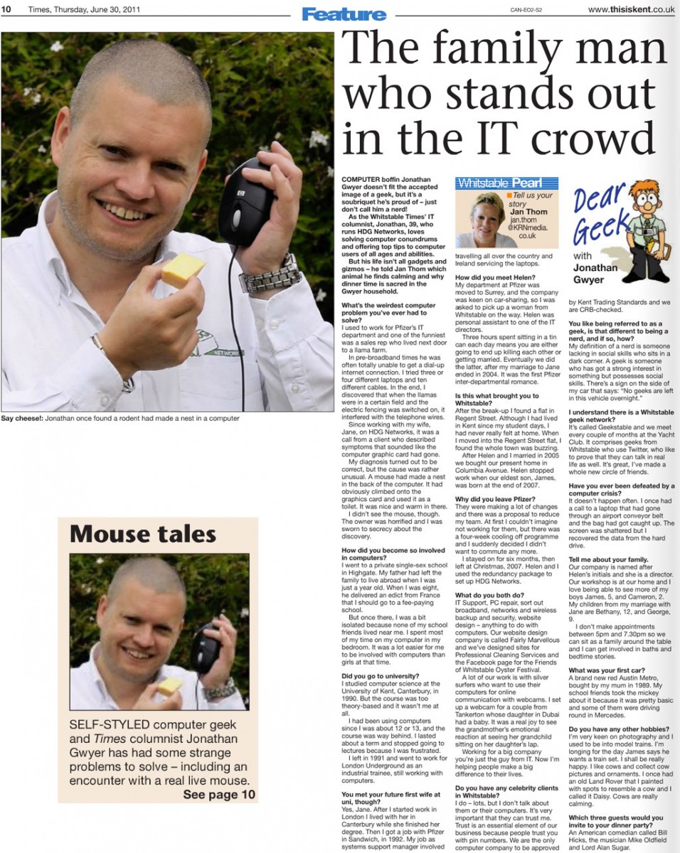 As I hinted at in a previous post about the definition of a geek – I had a nice chat with Jan Thom of the Whitstable Times last week, and today the results of that chat appear on page 10 of the Whitstable Times, along with me popping up on the front page too.