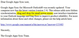 Most people will have realised by now that I’m a big advocate of using Google Apps for all things, especially email. There used to be one minor niggle though, that for some clients was a major annoyance. Using Google Apps Sync for Outlook, you weren’t able to drag messages from a different store (i.e. a different mailbox or account) into your main Google Apps account.